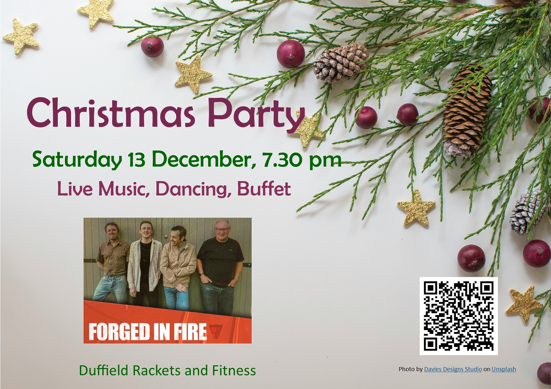 Forged in fire, a classic rock and pop cover band from Derby will play your favourite tunes, while Greg serves a luxury buffet to help you dance the night away. Book below and get Christmas off to a great start.